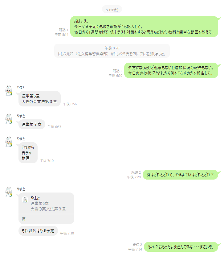 LINEで、本人・保護者・講師の3者でグループをつくり、毎日、トークで学習の予定や進捗状況などのやり取りを行います。ただし、そのグループトーク内においての保護者の発言はご遠慮いただきます。下:グループLINEのやり取りの例